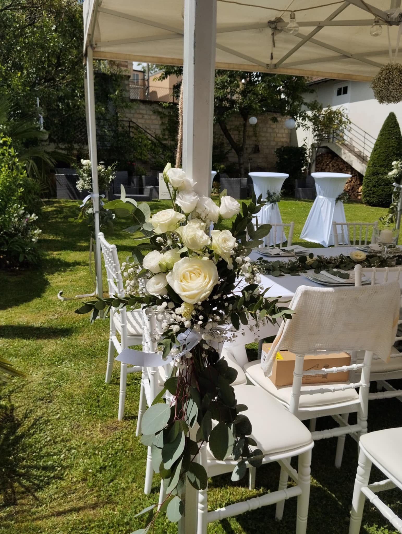 10 Boules de gypsophile, le chemin de table environ 10 m et 10 bouquets sur les piliers